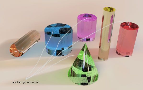 La dificultad que no consigo hacer (he probado con el Vray y con el Mental en el max) es que un cilindro transparente (con color) proyecte una sobra de su color, se podría modificar la propiedad de la sombra para que la luz proyecte sombras de un color determinado, pero si son varios los cilindros de colores y hay sola una luz?