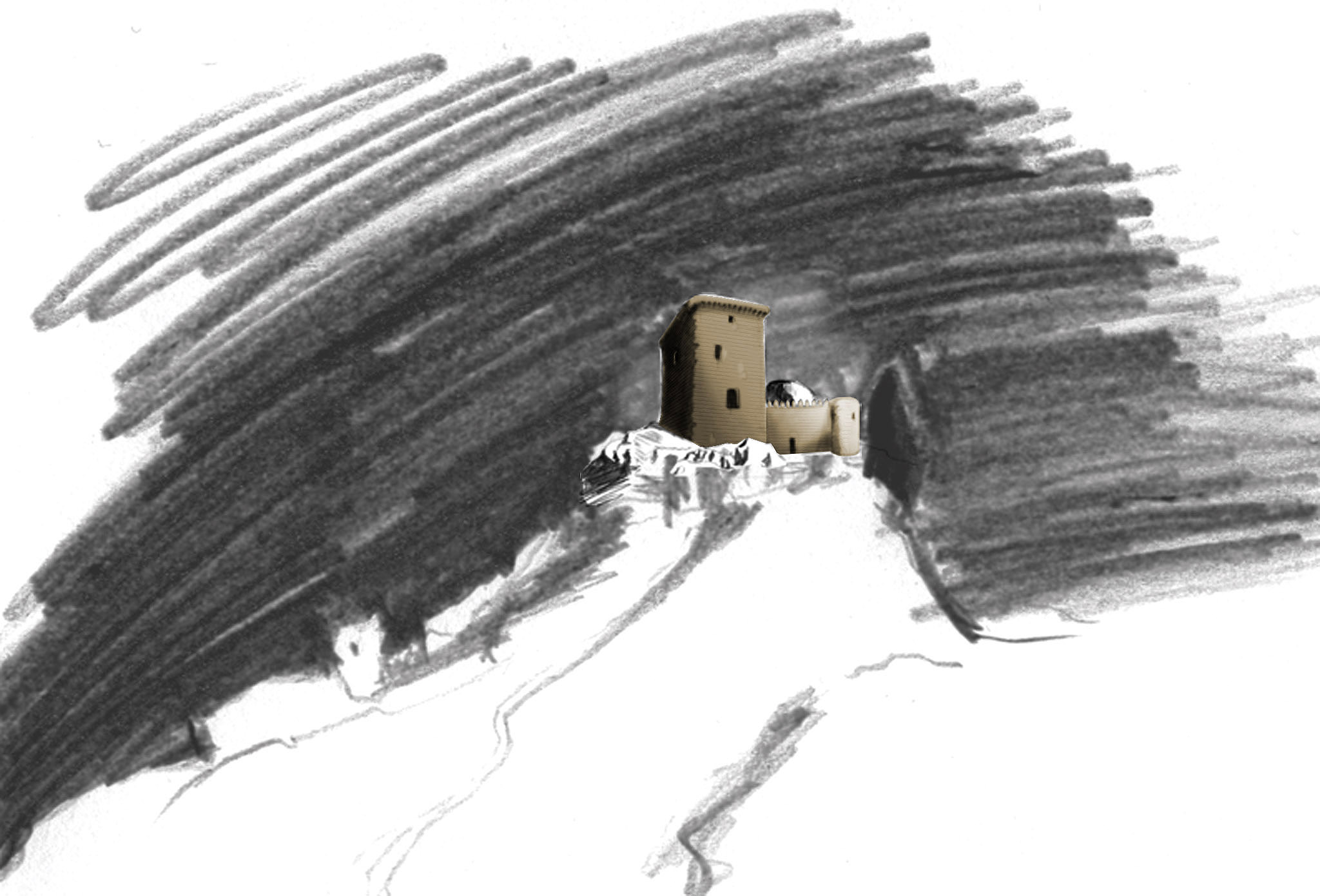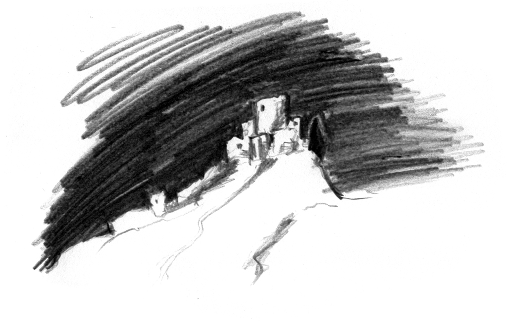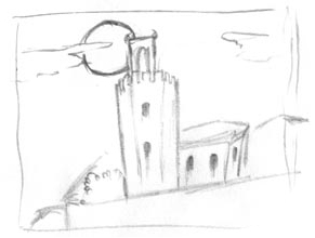 Ayer leyendo un artículo cultural en el periódico leí sobre la torre ensangrentada de Badajoz y me vino la inspiración. Me doy cuenta que mis dibujos se limitan casi exclusivamente a los personajes que conforman la escena. El fondo lo dejo en un segundísimo plano. Hice un par de bocetos y apunté algún dato sobre esta torre de los templarios decapitados, el tema tiene mucha chicha. Así que al levantarme hoy de mañana fue lo primero que se me vino a la cabeza y me dió por retomarlos y, por una vez, darle protagonismo en una obra mía a un monumento tan interesante. No voy a hacer un dibujo de la realidad, más bien es lo que me inspira todo lo que leí ayer con mi copa de licor café en mano. Primeros bocetos.