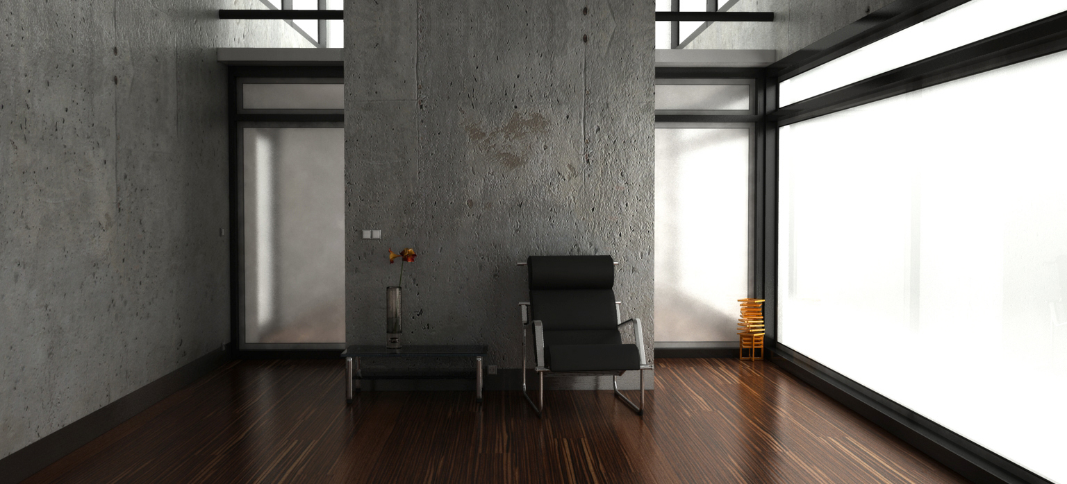 Johny me encanta toda la escena, la composición minimalista, la iluminación y esa elección de materiales que has hecho contrastando materiales más finos y elegantes como el parquet, el metal, el cristal, con materiales más toscos como el hormigón. Sigue así colega. Un saludo.