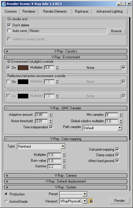 Luego voy aplicando materiales (o metiendo los objetos de otra escena) por orden de mayor a menor presencia y haciendo test. Normalmente paredes y techo lo primero, luego suelo, luego muebles. Es un poco lento, pero te aseguras saber el punto exacto donde surgen los problemas. Sobre la marcha normalmente se requiere hacer cambios en las opciones de render e iluminación, pero tienes un gran control sobre todo lo que haces.