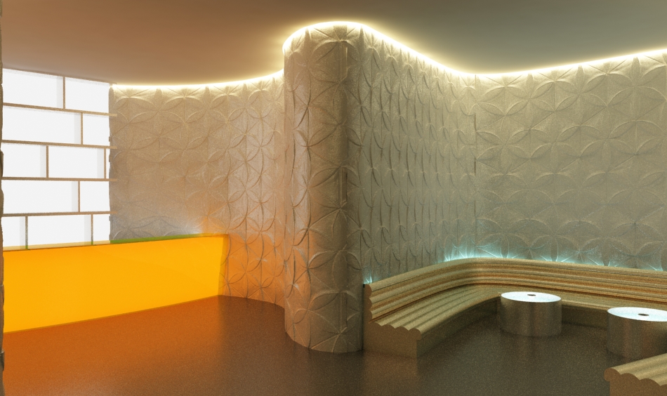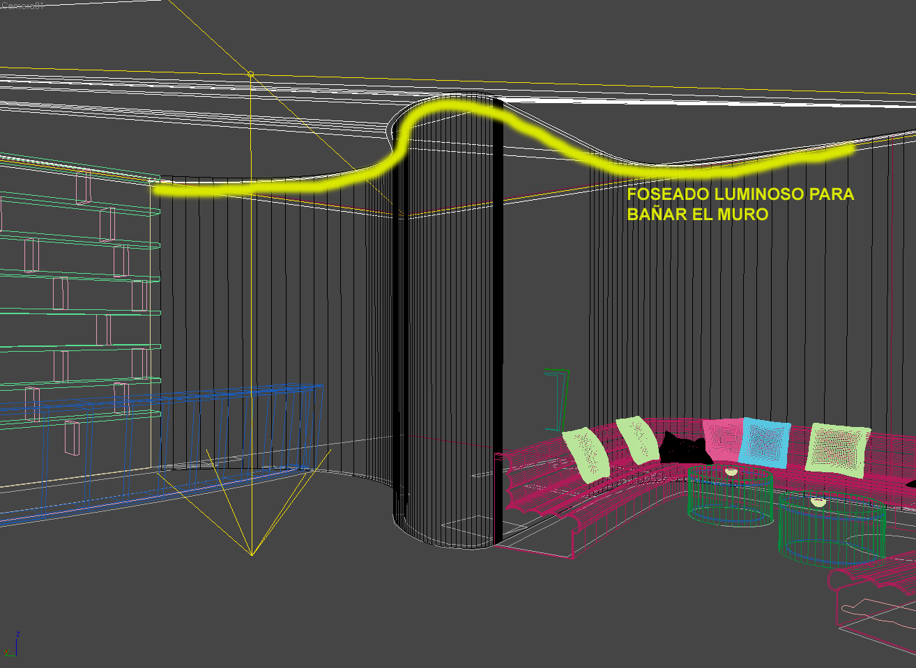 La luz Vray está situada por encima del techo que tiene una abertura lineal alrededor del muro curvo con la intención de bañar toda la pared.