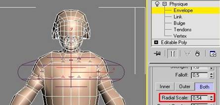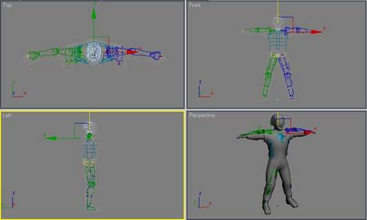 Ahora con los botones de mover, rotar y escalar no uniformemente empezamos a amoldar nuestro Biped para que se acomode al cuerpo, cuando modifiquemos una extremidades importante presionar el botón de simetría para que los cambios surtan efecto en la extremidad opuesta, después de un par de minutos deberemos tener algo parecido a esto.