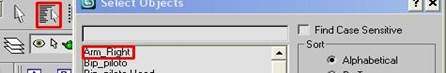 Si queremos seleccionar hueso por hueso, nos podríamos ir a seleccionar por nombre y encontraremos la lista de todas las partes, también el esqueleto entero que nombramos bip_piloto, el modelo no aparece en la lista por que lo tenemos congelado y no se puede seleccionar.