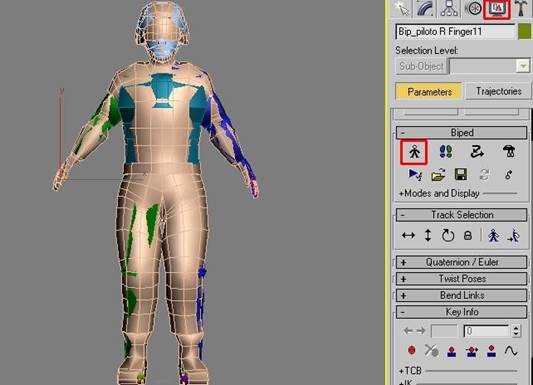 Ahora con nuestro Biped seleccionado nos vamos a motions<parameters. En la sección Biped escogemos figure mode, que es el muñeco que aparece en primer lugar, con esto podremos empezar a acomodar nuestro Biped para que se amolde al cuerpo.