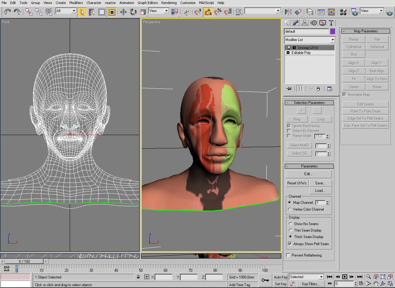 La primera imagen es el modelo en 3dsmax con un mapa creado en ZBrush. Lo hace más o menos bien, pero si consiguiera que UVW fuera desde frente creo que quedaría más ajustado. La segunda imagen es lo que consigo con el Unwrap UVW automático sin cambiar nada. Ese modelo exportado como obj a ZBrush ya pilla bien el mapa para texturizarlo.