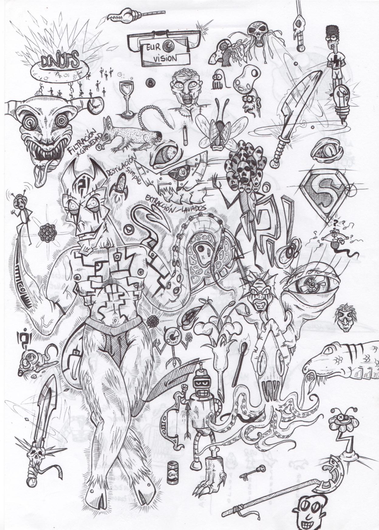 De paso para no crear más mensajes pongo un par de folios que no significan mucho, pero son simples dibujos entrelazados. Me resulta divertido observar la página y ver las diferentes locuras, ya que a medida que vas observando, ves nuevas cosas. En realidad, lo hacía en las clases de la universidad, por eso hay metidos un par de apuntes entremedio. Si alguno conoce el juego, algunas imágenes están inspiradas en armas y objetos de WoW (world of Warcraft: videojuego online). Espero que guste.