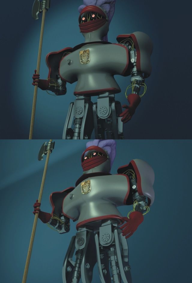 Este personaje ya lo modelé hace algún tiempo. Esta, el pobre, a la espera de que lo integre en algún fondo y/o lo anime, mi cuñado dice que no triunfa porque es muy feo el cabrón (textualmente). Yo creo que, es cañero. Quiero hacer que parpadee con las viseras del casco.