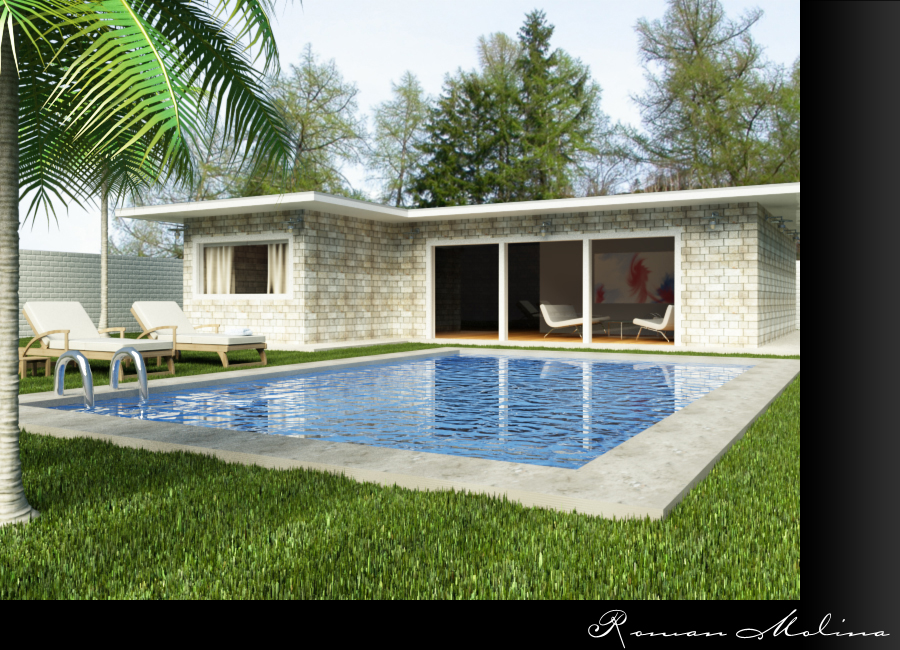 Te comento que tienes toda la razón con los tubos de la piscina, eso lo voy a corregir, por otro lado, es primera vez que trabajo con Vray Sun y Vray Sky y no le término de agarrar bien la configuración, la pared del lateral, la que está más a la izquierda, es de ladrillos blancos, pero la sombra de la palmera se difumina mucho y afecta el color de los ladrillos. No sé cómo lograr sombras más exactas con esta configuracíón. Me toca ponerme a practicar y a aprender con ensayo y error.