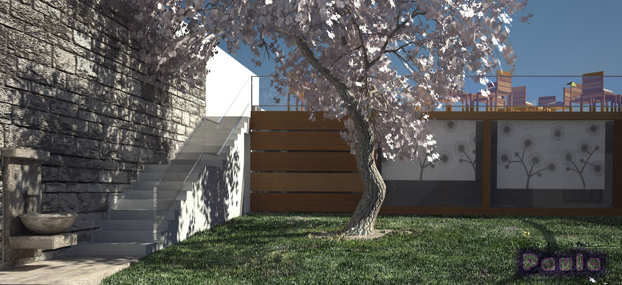 Posdata: : se me olvidaba, ¿Qué es esa mancha roja que hay en el cielo encima de las sillas de la derecha? Paula tienes que tener cuidado, cuando comas el bocata de chorizo, de no ensuciar el render.