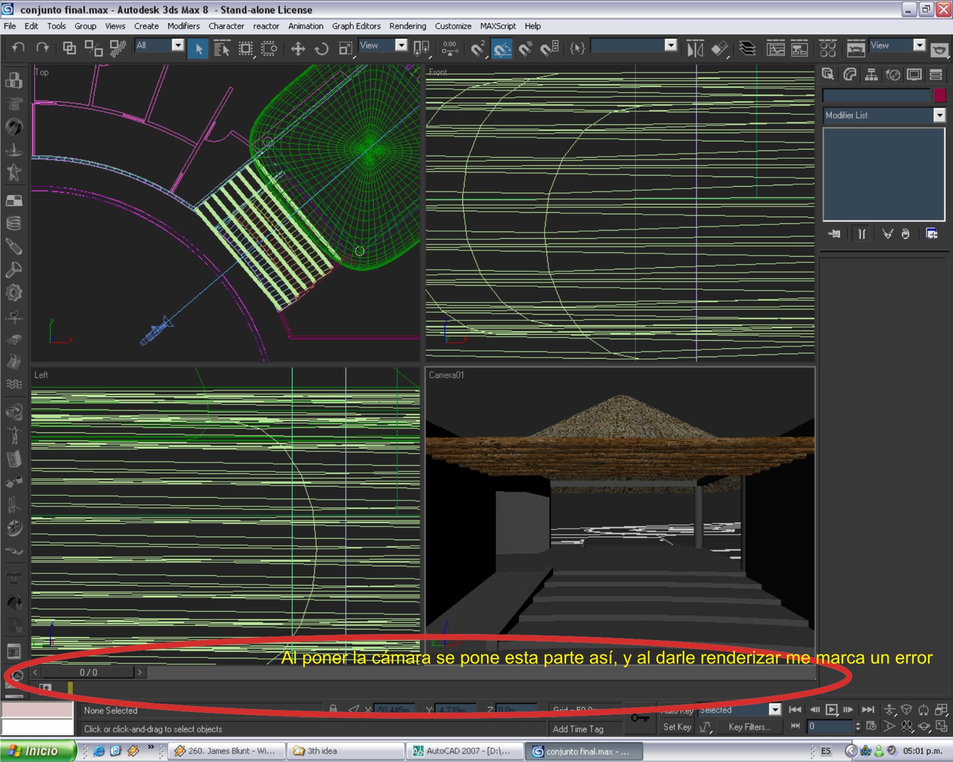 Resulta que si renderizo en modo perspective lo hace perfectamente, y al momento de situar una cámara darle render me sale el siguiente error. No sé qué fue lo que le abre cambiado para que me salga esto. Por que me di cuenta de que la parte dónde está la barra que marca los cuadros la borré. Tal vez sea este el problema. Ojalá puedan ayudarme. Saludos.