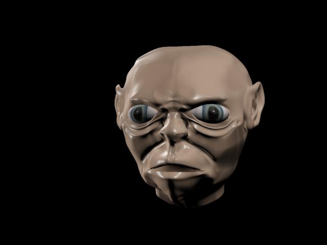 Mi critica, la forma de Golum no es correcta, tiene mucho más cráneo las mandíbulas más estrechas, la forma de los ojos no es correcta, las ojeras no se parecen a las de la referencia, las orejas son mucho más grandes, y los pómulos más pronunciados. También te diría que muestres una malla para ver cuanta geometría estas utilizando. El Shader que le has aplicado a los ojos deforma la textura, lo que hace que el personaje se vea muy raro. Mi consejo es que uses un Shader más neutro para todo el modelo durante el proceso de modelado y te olvides de momento de texturizar.