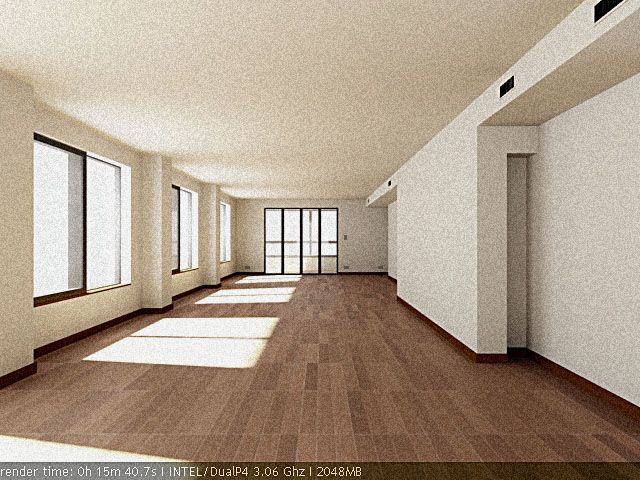 Tengo que lograr la imagen de esta primera fotografía lo más fotografía realísticamente posible. La imagen del recuadro en rojo es sobre la cual estoy trabajando. Este interior estará amoblado y equipado en los próximos días, pero por ahora está vacío y lo estoy aprovechando para lograr la mejor iluminación posible. En los próximos mensajes les voy a explicar lo que ya tengo hecho y los settings de Brazil. Les pido un favor ya que, esto es de suma urgencia. Cuando me hagan una crítica, les pido si me pueden dar una solución específica para lograr lo que me dicen. Les digo esto porque yo soy consciente de casi todas las deficiencias que tiene la escena, pero cómo todavía no tengo un manejo idóneo de lo qué significa cada setting mi única manera es la de aprender toqueteando hasta que de a poco vaya aprendiendo la teoría de la GI. La escena esta iluminada con una luz sola Brazil spot light, bueno, aquí vamos, desde ya les agradezco.
