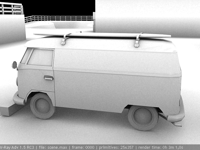 Son unos 2400 polys por que el símbolo de vw lo hice por Splines y casca 500, pero, en fin, está casi que terminada, faltara poner el tubo de escape, la maneta para abrir la puerta y tal y modelar bien la tabla de surf y ya está, bueno quizás con este lo texturice ahora flores o algo que le tengo ganas a hacerlo hortero.