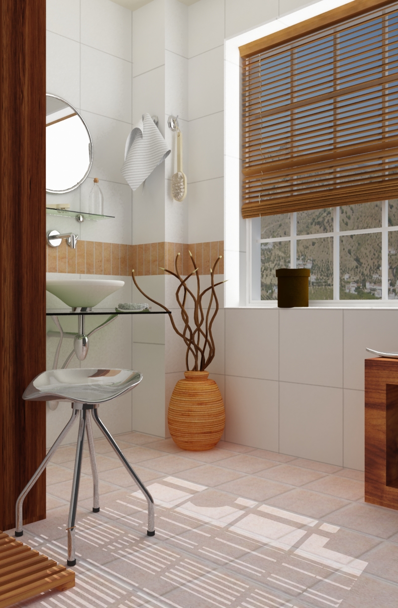 Y luego cuestión de detalles como, quitar la tapa para que los juncos, bambues, no lo atraviesen(solo importante si haces una imagen detalle de esta zona). La caja de la repisa como te han comentado ya queda poco real. El material del taburete es demasiado, limpio, brillante. No sé, trastea si te apetece la escena probando cosas, el espacio da mucho juego de decoración. Un saludo.
