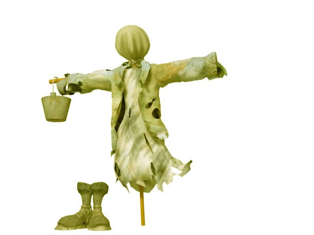 Me encanta el espantapájaros, está muy bien logrado. Además, el estilo me recuerda a un personaje del Final Fantasy IX. Me gustan las botas, pero la suela tiene algo de cuña, de todas formas, la imagen resulta cálida, y el espantapájaros es siempre un icono misterioso y que llama la atención. (eso creo).