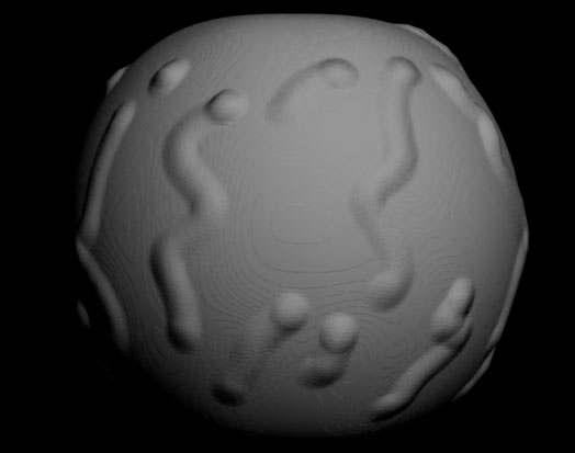 Tengo una especie de pelota con pocos polígonos en 3dsmax la exporte a ZBrush, la modele un poco en ZBrush y de ZBrush exporte el displacement map y lo puse en 3dsmax en el vraydesplacementmod renderizando con Vray.
