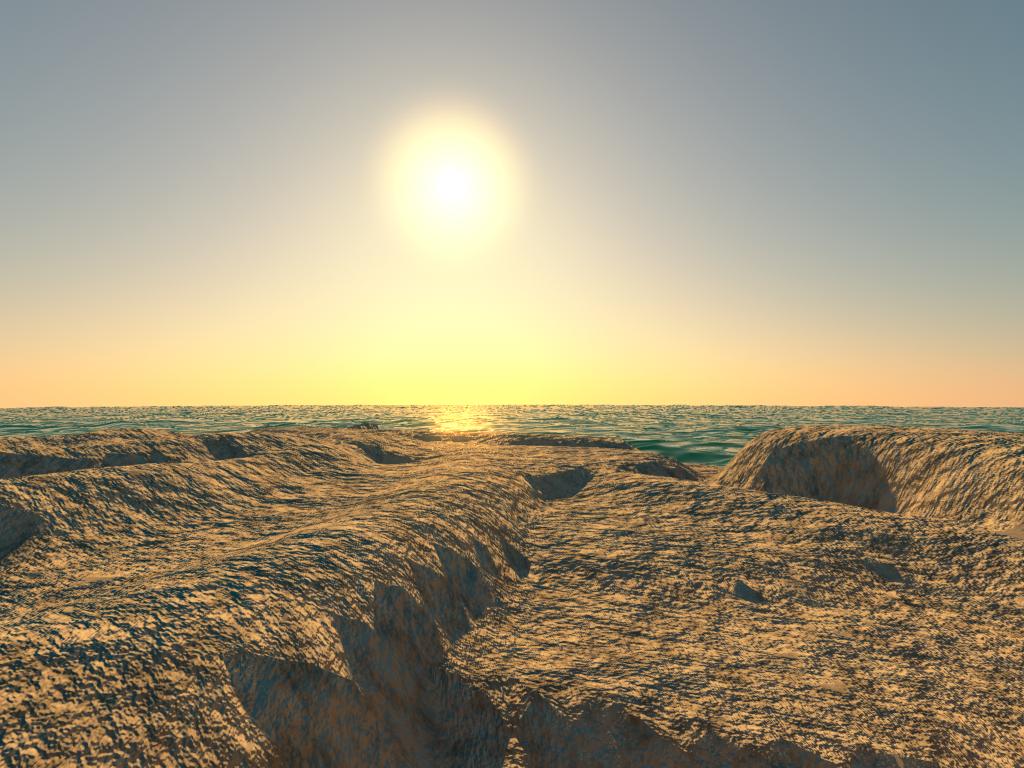 Dejo mi humilde imagen si debería recortar algo serían pocas cosas, como agregarle una leve neblina o hacer mejor el Glow del Specular en el océano, aclaro que esto lo hice en Maya con Mental Ray con su apartado de iluminación Sun y Sky. Les dejo el wire y render final.