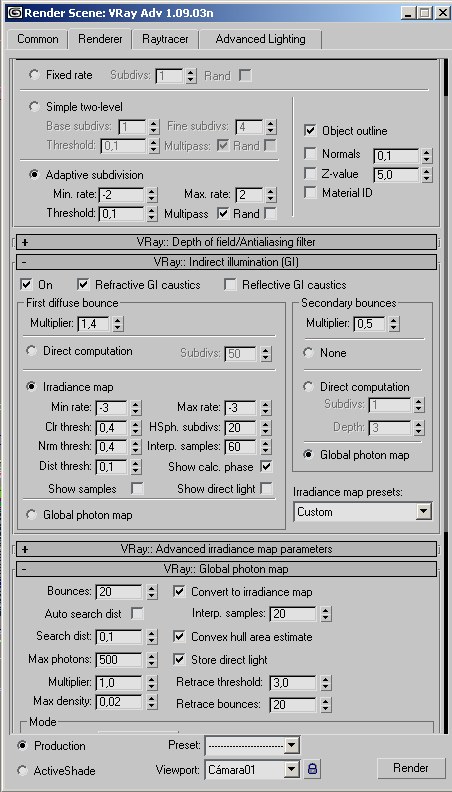 Hola a todos, mi problema es que, al hacer un render de un salón a800 por 600 -3 -3 no tengo ningún problema en el render, pero al subir el tamaño de la imagen y calidad a 2000 por 1500 -3 -1 me salen unas manchas en una esquina y en el techo. Estoy utilizando irradiance en el 1º y fotones en el 2º.