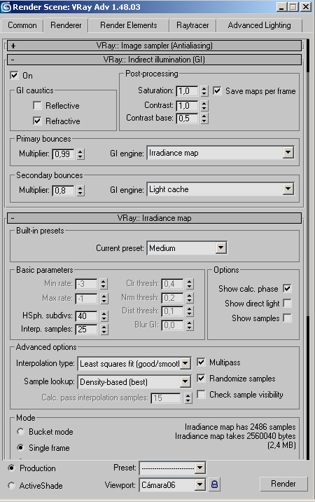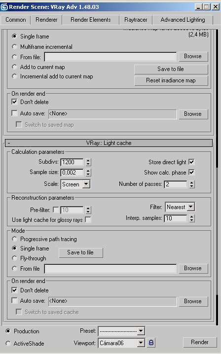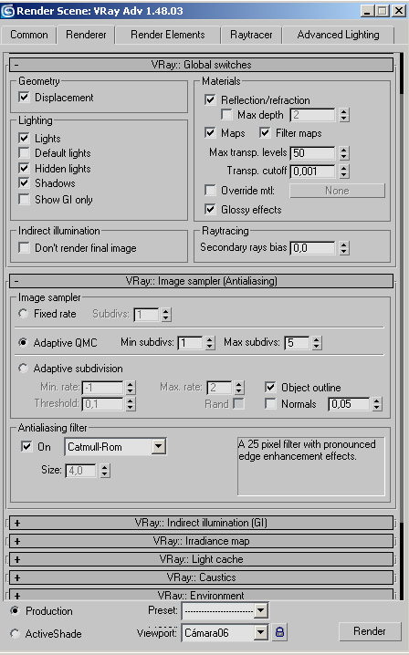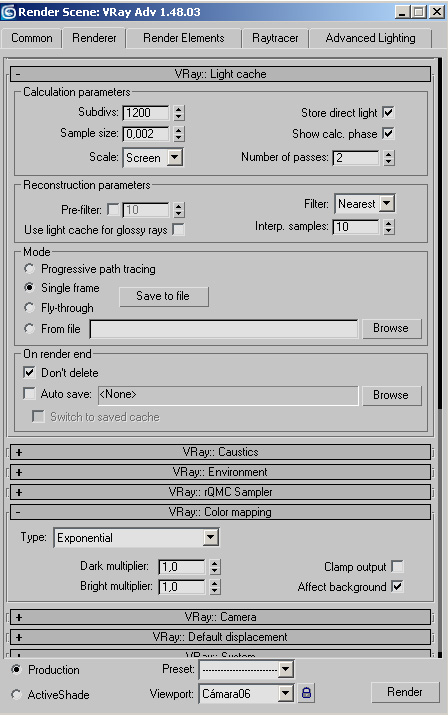 Bueno como me habéis preguntado, el renderizador que utilizo es el Vray-1.48, aquí os envío la configuración que he utilizado para que veáis si tendría que cambiar alguna cosa.
