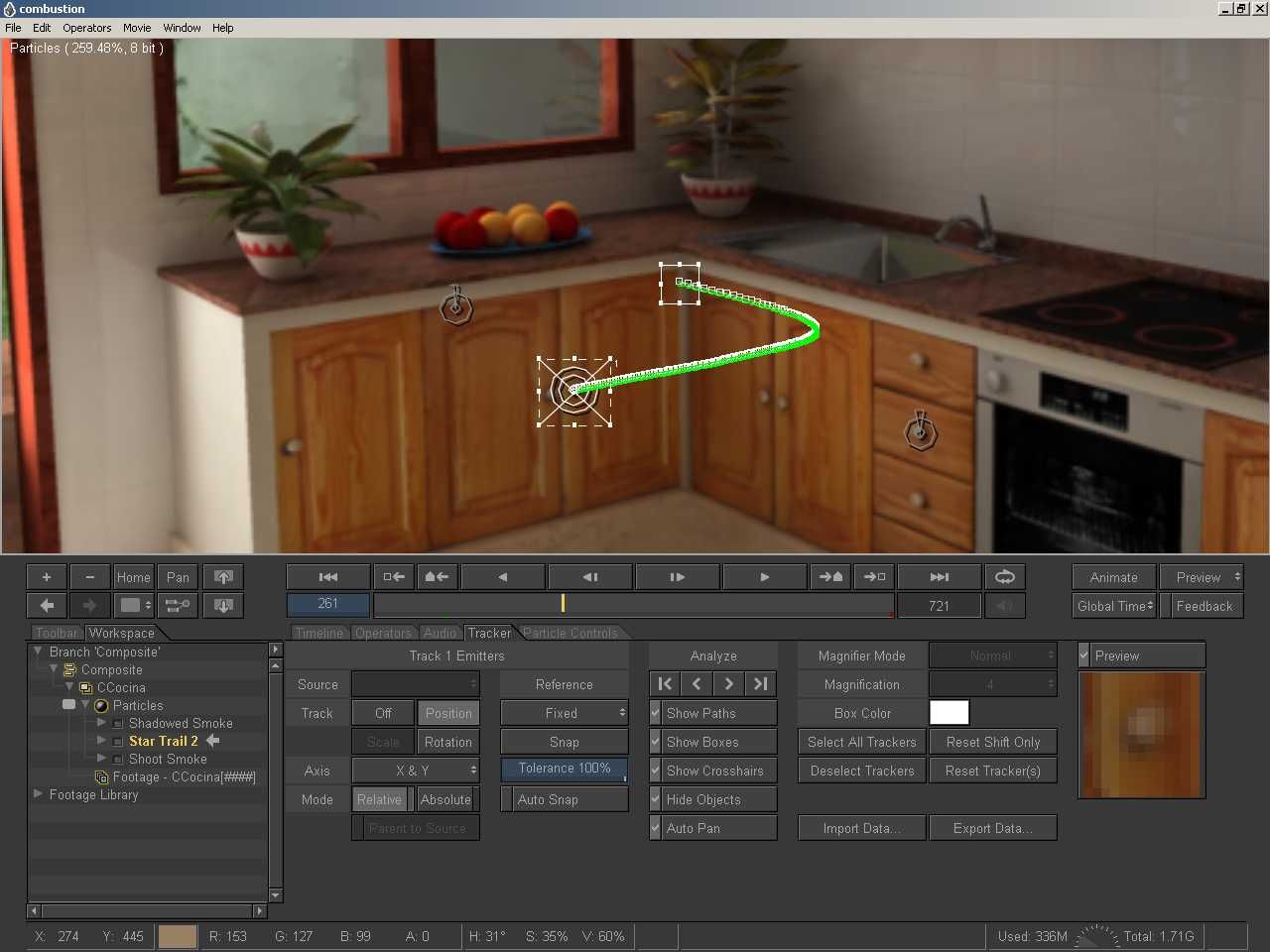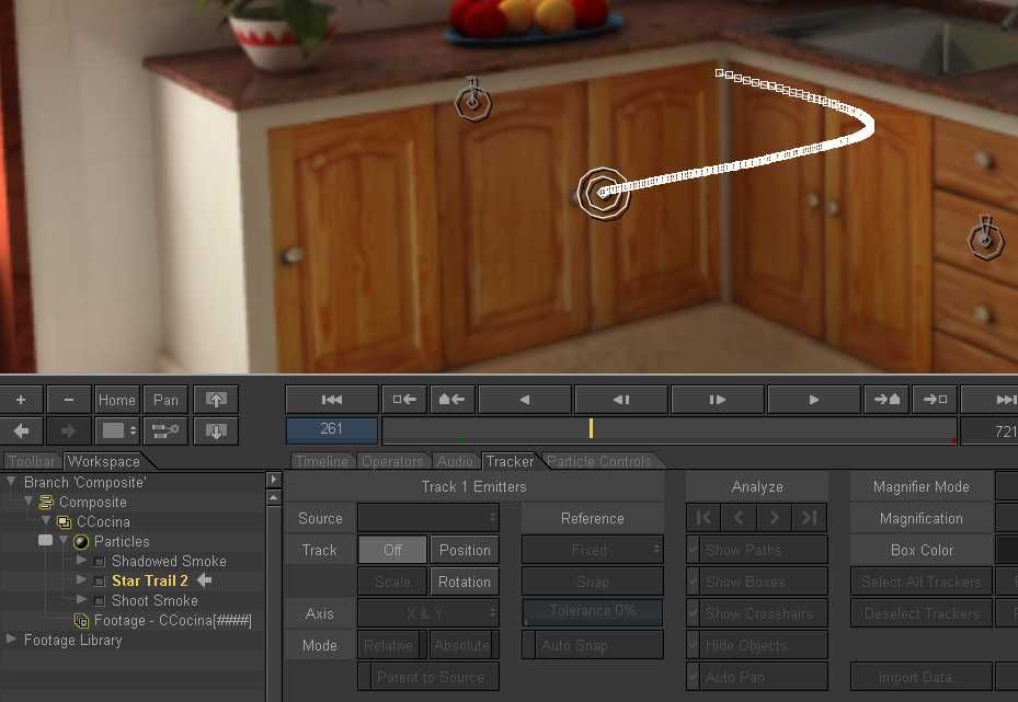 8: seleccionas la 3ª partícula a la que le vas a hacer el tracking, seleccione posición, picas analize la flecha que indica hacia la derecha, comienza el tracking, picas en la misma flecha para pararlo, y con suprimir eliminas las claves desde la última hasta la primera una por una. Una vez terminado el tracking de esta partícula le das a of.