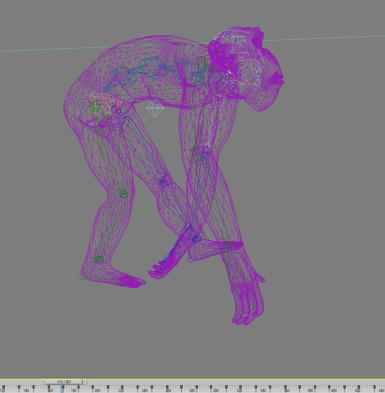 Necesito hacerlo andando durante un tiempo así que, le meto unos footsteps y guay, el personaje anda. Resulta que el personaje es un mono y la animación de andar obtenida es de un humano totalmente erguido. He intentado ir a los huesos de la espalda para encorvarla, pero nada sigue manteniendo la animación generada por las huellas.