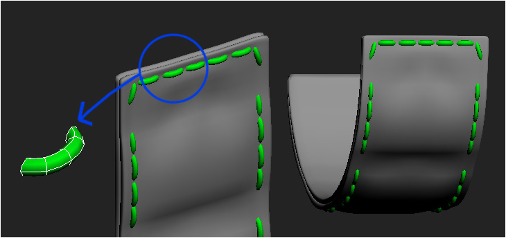 Las costuras de la correa de cuero son bastantes simples, solo modele un cilindro doblado, lo multiplique ha lo largo de la correa, y luego lo doble todo junto.