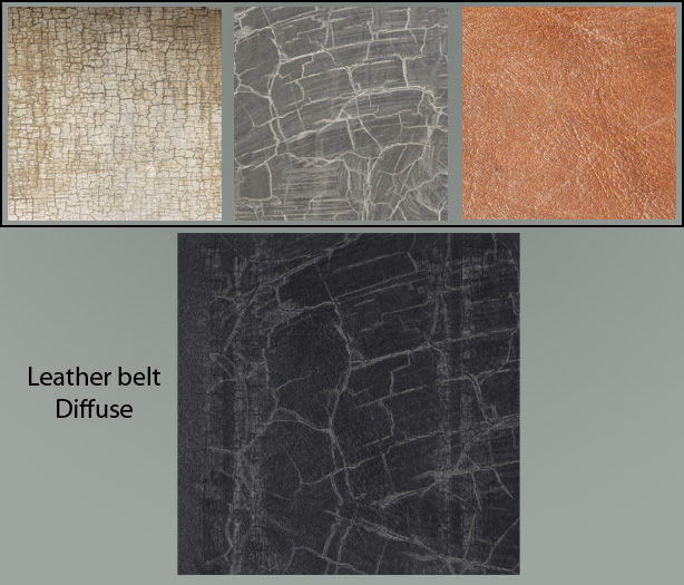 Algunas texturas como la de la correa fueron hechas jugando en Adobe Photoshop con algunas fotografías descargadas de internet. La apariencia que quería obtener en la correa de cuero fue difícil de encontrar, así que, use algunas grietas de piedra y las mezcle con algunas texturas de cuero.