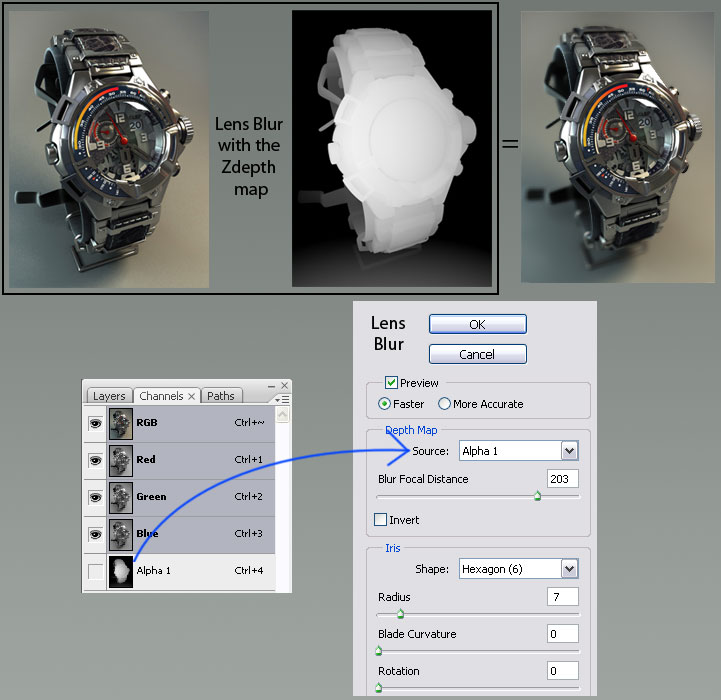 En Photoshop cree un nuevo canal (alpha 1) en la imagen renderizada y puse el render de Z-Depth allí, hice esto para poder usarlo en el filtro Lens blur, el valor blur Focal distance controla donde empezar a desenfocar y el valor Radius controla su intensidad.