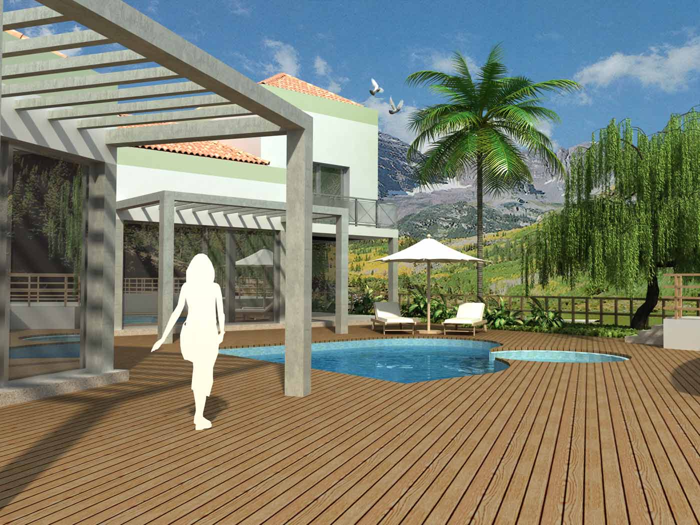Pues yo cambiaría el sauce llorón por una hilera de palmas y lógicamente el fondo (pues se quiere mostrar un clima tropical y no de páramo). En primer plano la textura del concreto en la pérgola es muy poco real. Un saludo.