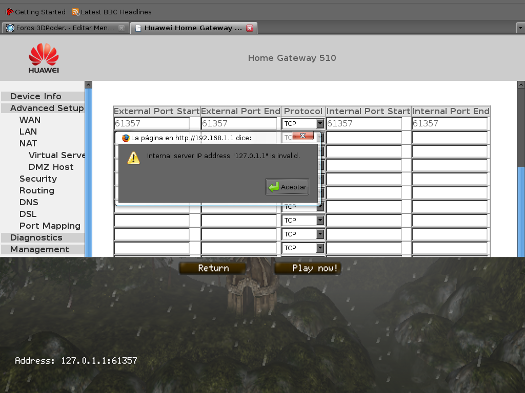 Solo hay un problema el router no permite la dirección 127.0.1.1:61357 que tiene predeterminada el juego.