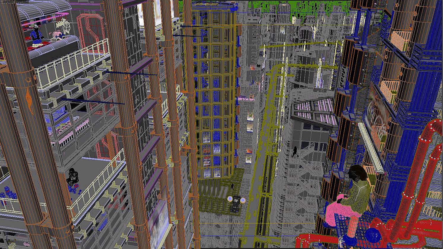 Realmente impecable, creo que hay varios puntos de interés, la persona sentada a la izquierda, ese vehículo que parece un auto volador que se ve abajo, las publicidades, es una escena de película, muy, pero muy bueno.