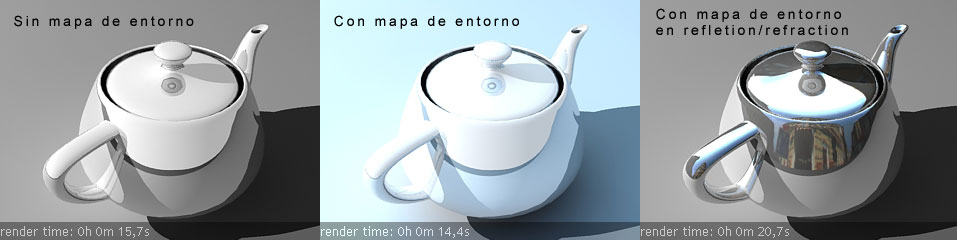 GI environment (skylight): override maxs: activa la iluminación global del entorno, pudiendo ser aplicado un color especifico o una imagen. Si utilizamos está casilla anularemos el efecto del entorno del 3ds Max sobre la iluminación, el multiplier nos permitirá regular la intensidad de esta iluminación, (por defecto 1), reflection/refraction etc environment: similar a GI environment, pero aplicable solo a las reflexiones y refracciones de los materiales.