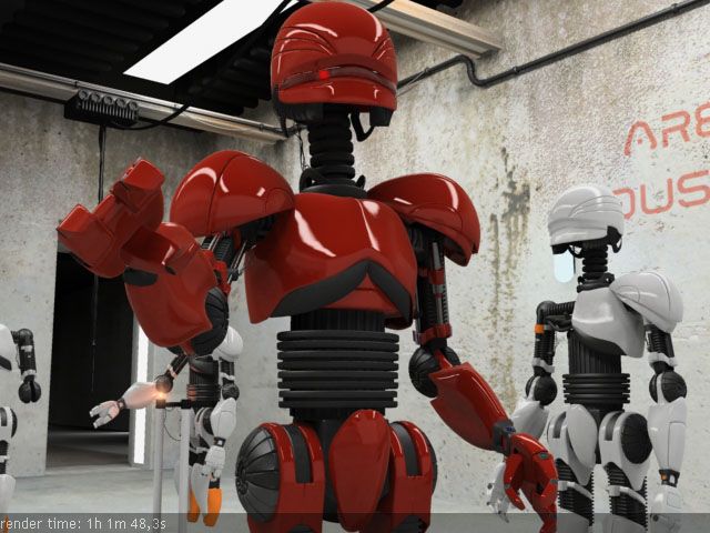 Pues veras Mars, la idea es una especie de base en donde se reparan-montan robots. Los blancos están por definir, son una especie de ejército imperial (Lucas siempre tiene que rondar por ahí), y los rojos serían los robots encargados de hacer las reparaciones. En el momento de la imagen el robot rojo ha advertido que estamos en el lugar y viene hacia nosotros para, decirnos amablemente que aquí no se puede grabar, una escena semi-paparazzi. Estoy pensando en diseñar algún nuevo robots, tipo r2 que fueran reparadores.