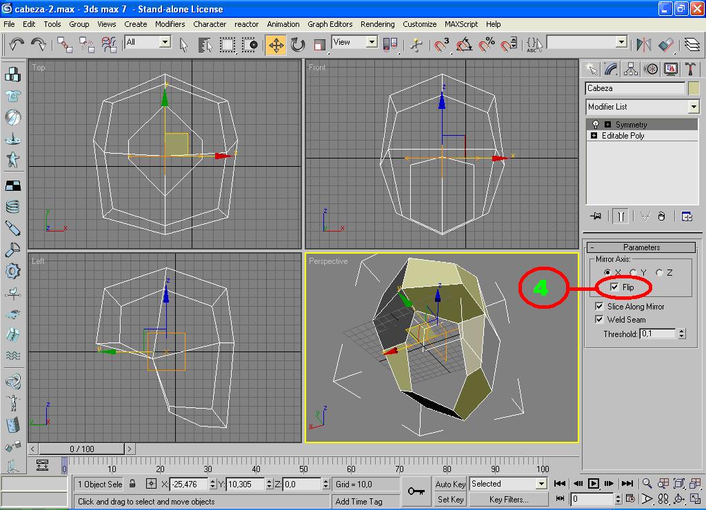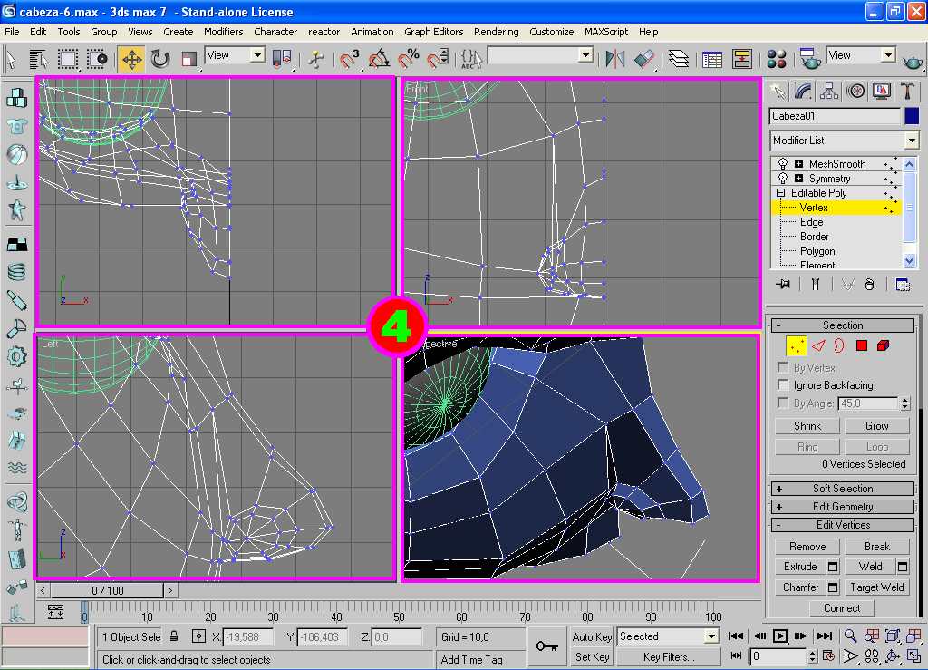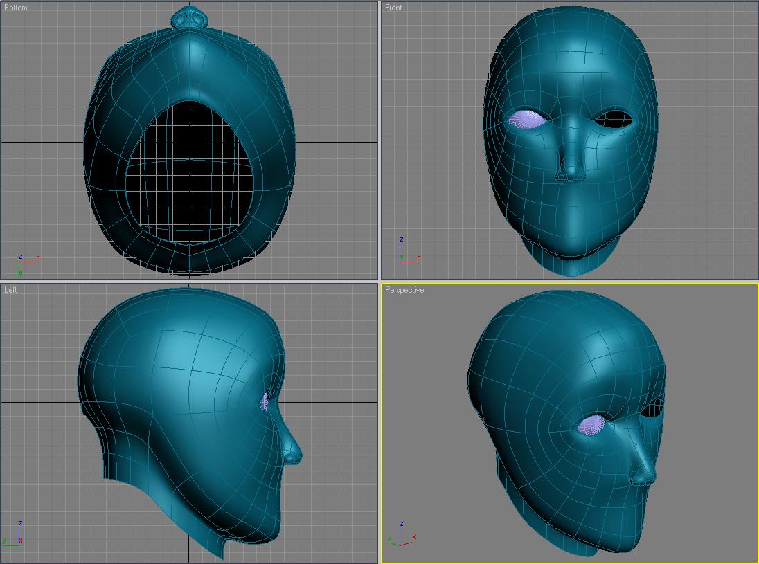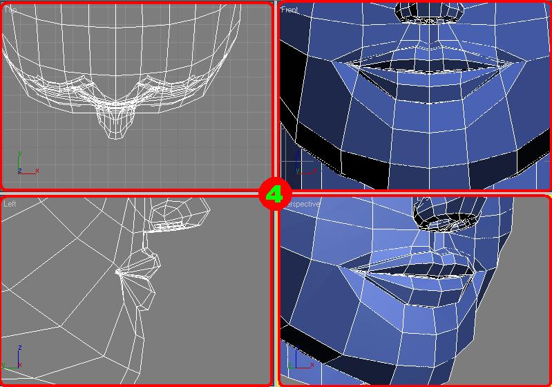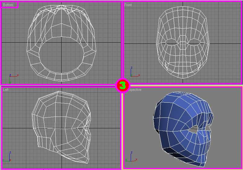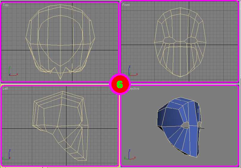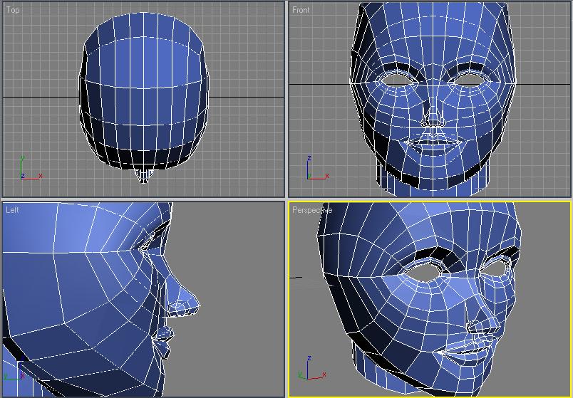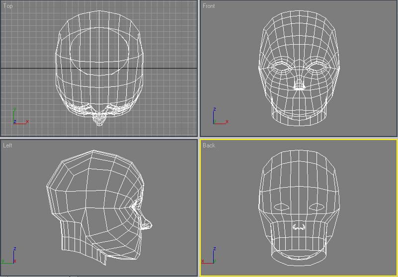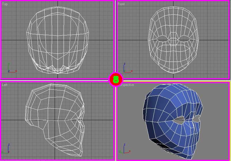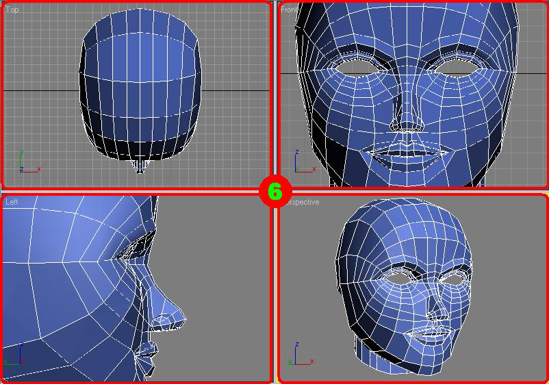 2, mueva los vértices de la cabeza hasta que quede igual que en la figura. Nota: para mover los puntos hágalo desde las vistas de front (frente) left (izquierda) top (superior) no lo haga desde la vista perspective (perspectiva) ya que esta vista tiene los tres ejes y es muy difícil de moverse, esta vista se usa para ves la forma en tres dimensiones mientras las otras solo la muestra en dos dimensiones.