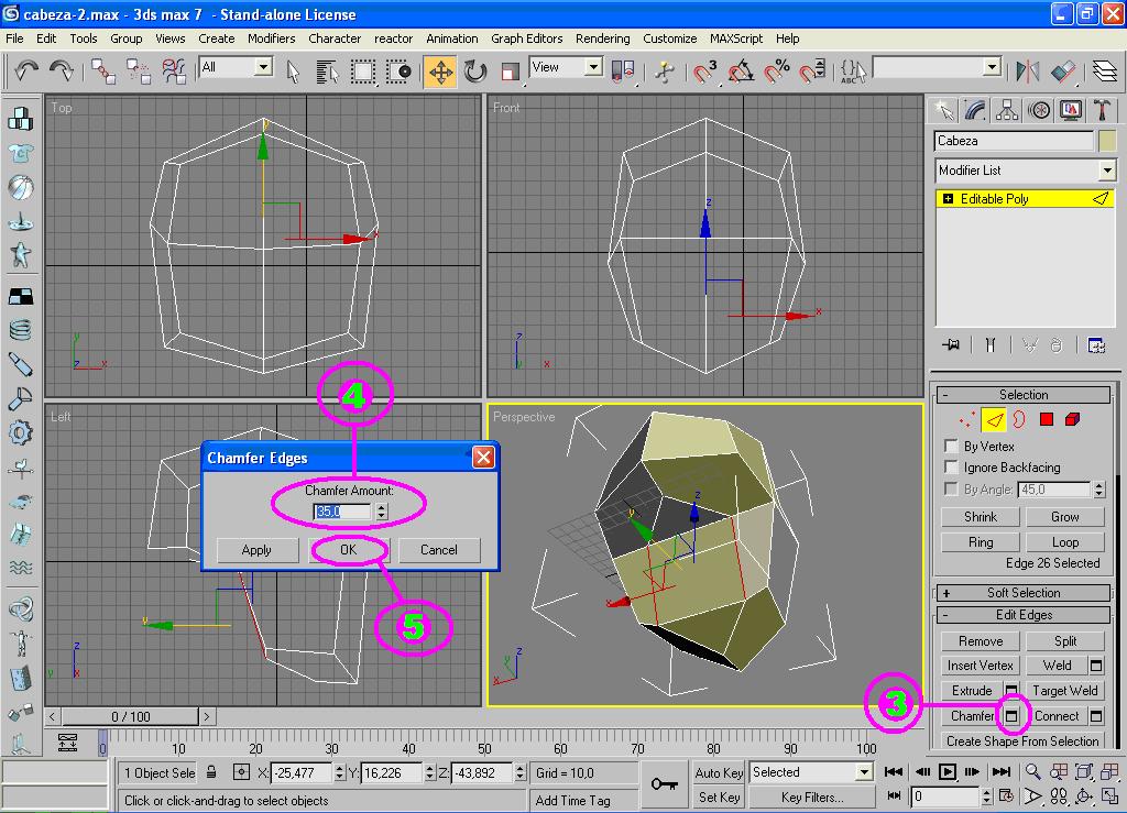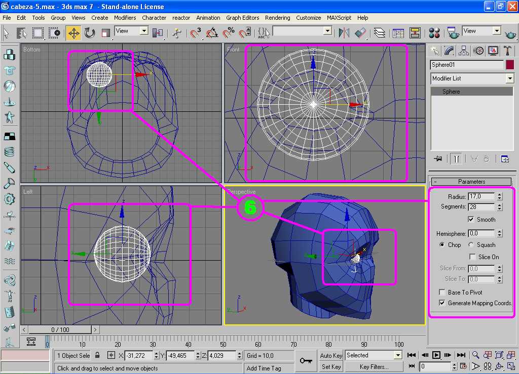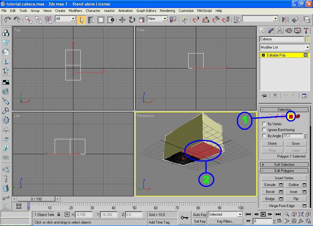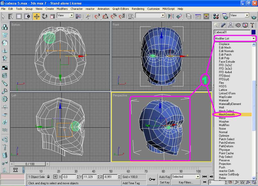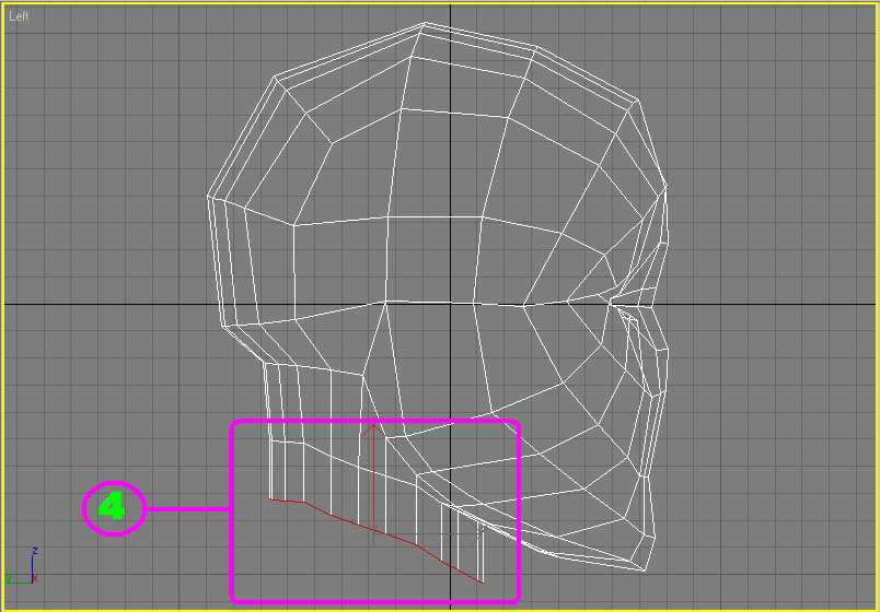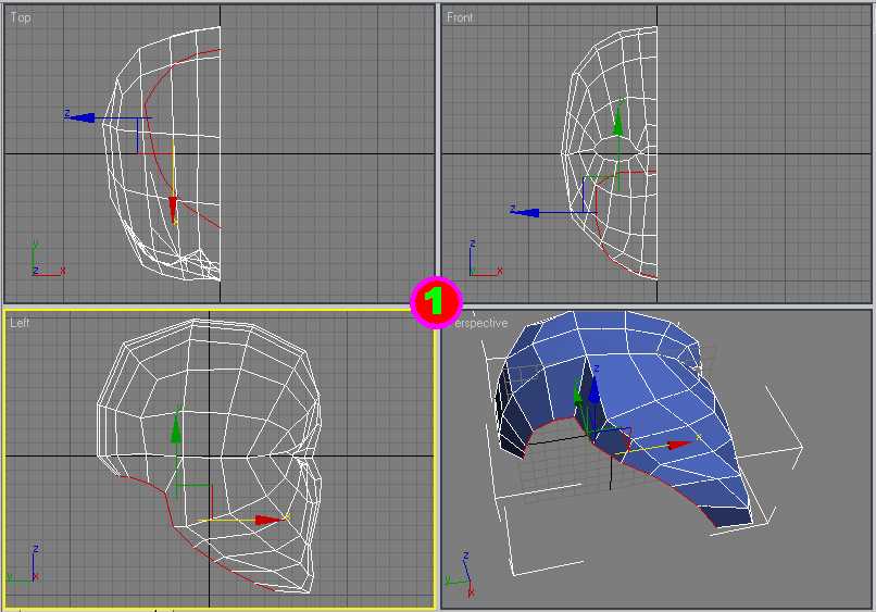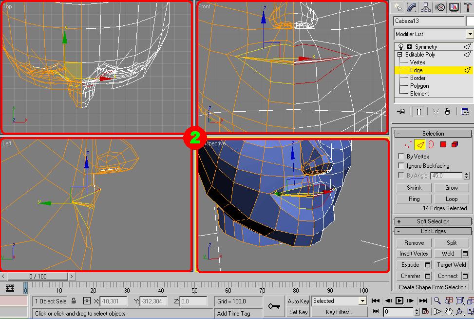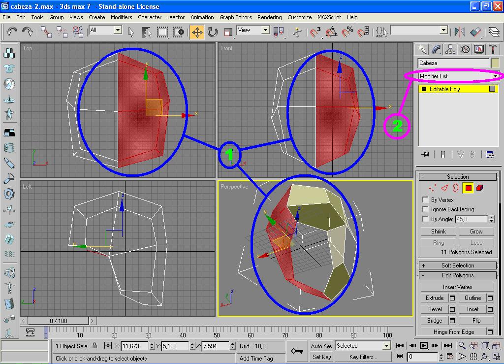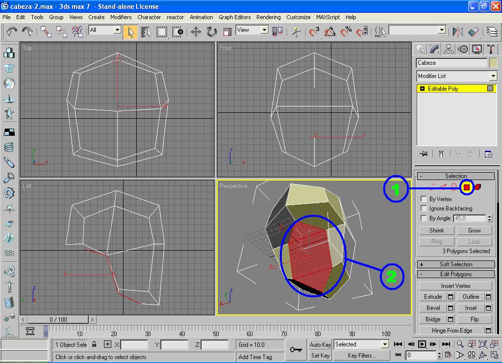 2, mueva los vértices de la cabeza hasta que quede igual que en la figura. Nota: para mover los puntos hágalo desde las vistas de front (frente) left (izquierda) top (superior) no lo haga desde la vista perspective (perspectiva) ya que esta vista tiene los tres ejes y es muy difícil de moverse, esta vista se usa para ves la forma en tres dimensiones mientras las otras solo la muestra en dos dimensiones.