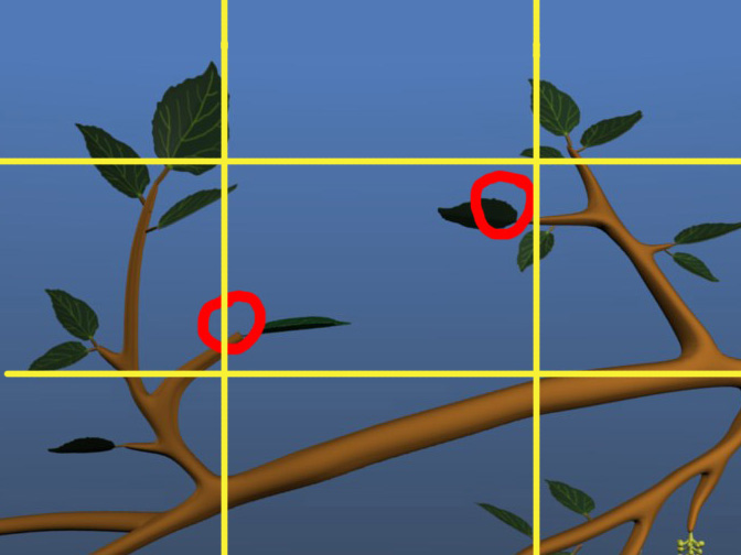 He intentado seguir la regla de los tercios, pero lo que no estoy seguro es de conseguir darle algo de profundidad (y eso que la rama de abajo va hacia el frente), y tampoco estoy seguro sobre el reparto de componentes en la escena.