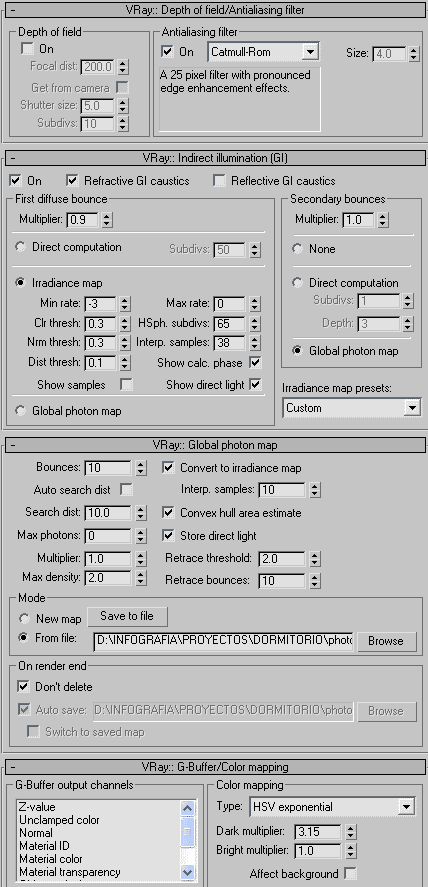 Aquí os dejo los parámetros de configuración del render. He utilizado dos luces, una Vray Light y una direct con 2000 y 2500 Diffuse subdivisiones respectivamente. La Vray Light tipo Skyportal y estore with Irradiance Map.