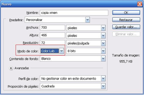 Pulsamos Control + a para seleccionar toda la fotografía ya que vamos a trabajar con una copia. Cuando esté seleccionado pulsamos Control + c para copiar la selección al porta papeles. Ahora pulsamos Control + N para crear una nueva imagen tomando las mismas medidas que la selección. En la ventana que aparece le podemos poner el nombre que queramos y sólo cambiamos la opción modo de color a color lab, todo lo demás lo podemos dejar igual.
