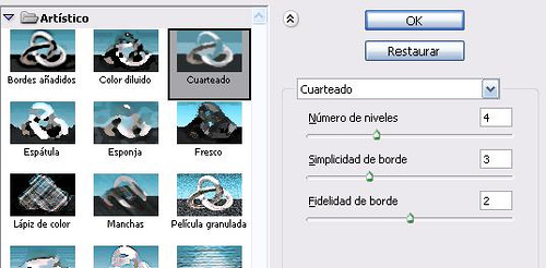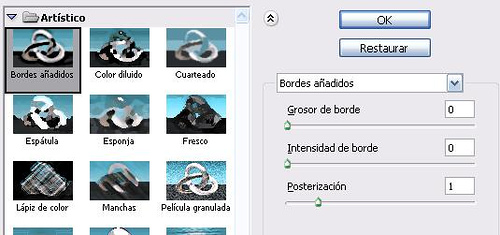 Aplicamos un filtro artístico en filtros/artístico/bordes añadidos con estos parámetros.
