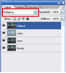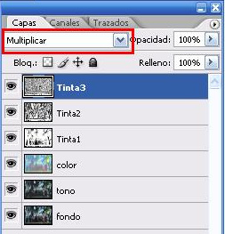 De nuevo volvemos a duplicar la capa de fondo y a situarla al principio de las capas. La llamamos tinta1. Y establecemos un modo de multiplicar, como muestro aquí.