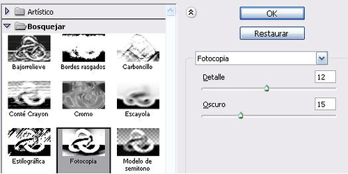 De nuevo un filtro más. filtro/bosquejar/fotocopia con los valores que ves y seguidamente vamos a imagen/ajustes/umbral y ponemos un valor de 100.