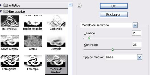 Aplicamos otro filtro/bosquejar/modelo de semitono, con estos valores.