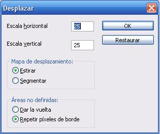 Vamos a utilizar la fotografía llamada dispmap que habíamos guardado antes, para ello vamos a filtro/distorsionar/desplazar, le aplicamos los siguientes valores y damos a ok.