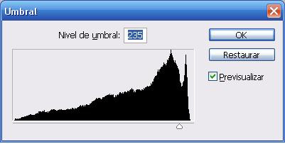 Para finalizar, asegúrate que tienes seleccionada la capa tinta3 y ve a imagen/ajustar/umbral y a partir de un nivel de umbral de 200 ve jugando con los valores para observar el resultado y escoger el que más te guste. Yo me he quedado con 235 para esta fotografía.