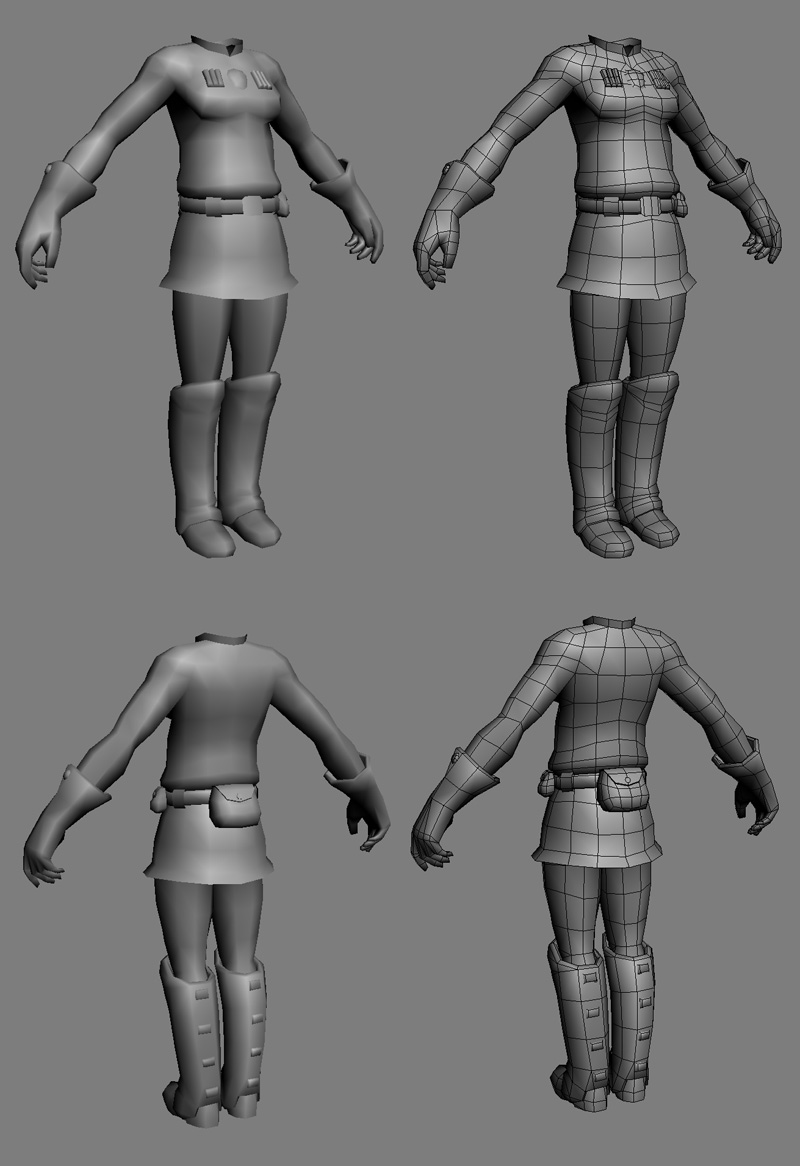 Hola. Aquí el modelo del cuerpo : 2400 tris. Me queda 800 para la cabeza y los pelos. Y 150 para las dos espadas (son sencillos).