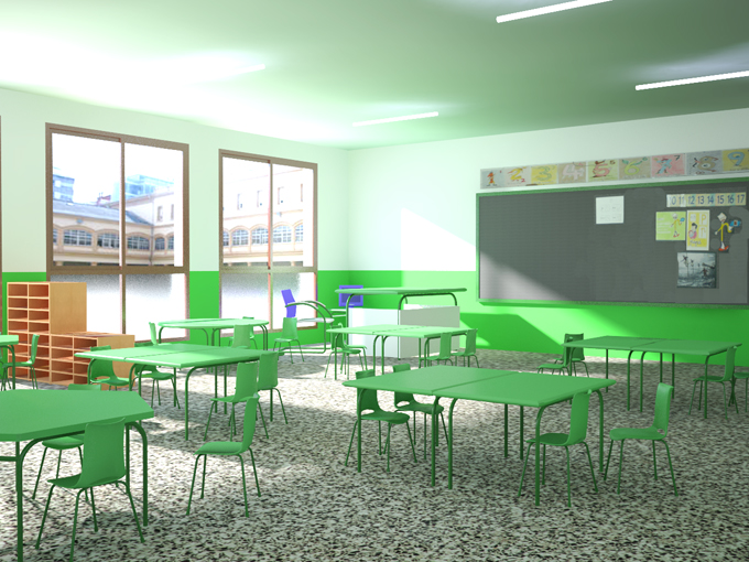 Yo lo miro muy bien para ser el inicio, la Physical Cam no la domino bien, pero el reflejo de la luz en el techo encima de la ventana lo veo muy fuerte, a menos que venga desde abajo, el piso nos e distingue de que material es, las mesas que creo sena plásticas o algo así con metal, deberías de hacer los dos materiales y al plástico o lo que sea darle un poco de Glossy para que se vea algún tipo de brillo o reflejo, igual al metal dale un poco cromado, en el techo n se si sean luminarias o tragaluces nos e entiende si son lámparas, pues deberían verse apagadas por que es de día, además si puedes agrega unos cuantos juguetes y más colores primarios básicos en los centros escoalres de niños, vas muy bien y suerte, sigue con el podrá quedarte super.
