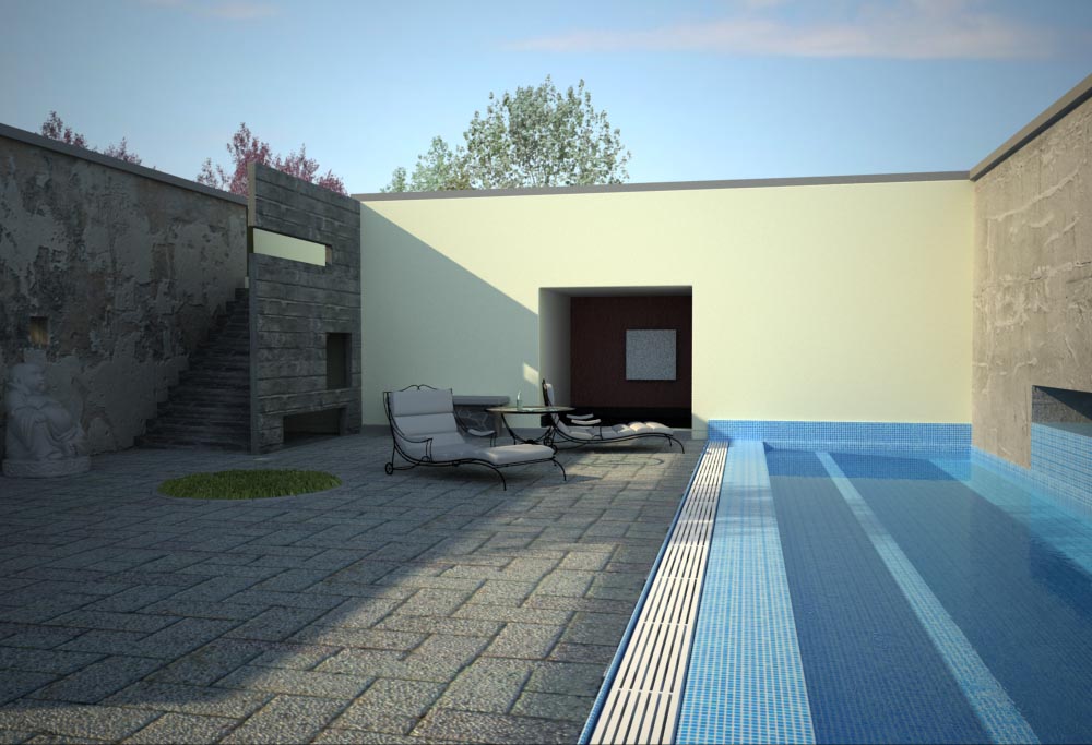 Hola. Me agrada tu escena, se ve muy bien y más con tu textura deteriorada en los muros, le da más naturalidad a tu imagen, aunque coincido con Jovel esa agua de la piscina no me convence, creo que si le das movimiento se vería mejor ya que no distingo donde termina el agua en la piscina y eso le resta realismo, aunque tienes razón que el agua en las piscinas suele ser muy lisa, pero en tu escena no te ayuda. Saludos.