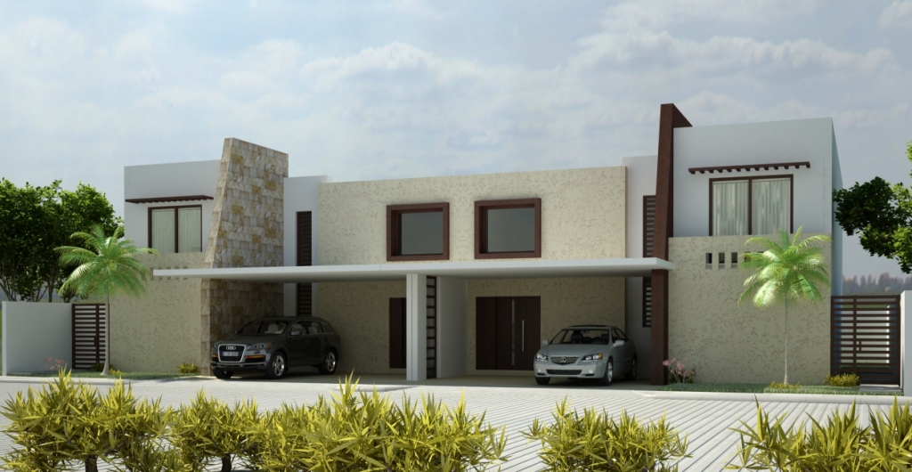 Vaya, no le veo problema a las sombras, ahí están, es cosa de observar un poco, lo que podría pasar es que el sol está en cierta posición que la fachada se ensombrese de una manera un tanto uniforme, pero, aun así, si hay cambio de tonalidades, y si observas el piso y pasto ahí verás también las sombras proyectadas, de igual forma gracias por el comentario, también la lejanía puede que esté influyendo, ya que, como tenían que salir ambas casas me obligó a que la toma sea muy abierta.Caray, no veo sombras proyectadas por los volúmenes de la casa, pareciera como si no hubiera sol. Solo ese detalle tan grande pude observar, en cuanto lo demás bien Rappaniu.No, tiene un azulejo color wengué, petición del cliente para diferenciar las casas, saludos y txs.Lo veo muy bueno inclsive de sombras, pero bueno, pregunto le falto material de piedra a la pared que da con el Garage del lado derecho?