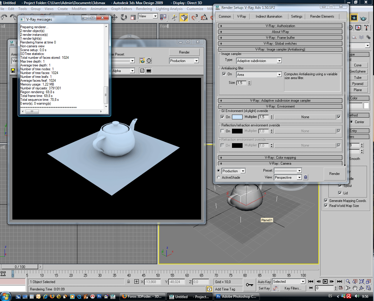 Y creando una escena simple con un plano y una tetera y una luz (la del tutorial). En el tutorial bien de 8s de renderizado y a mí me tarda 71s.
