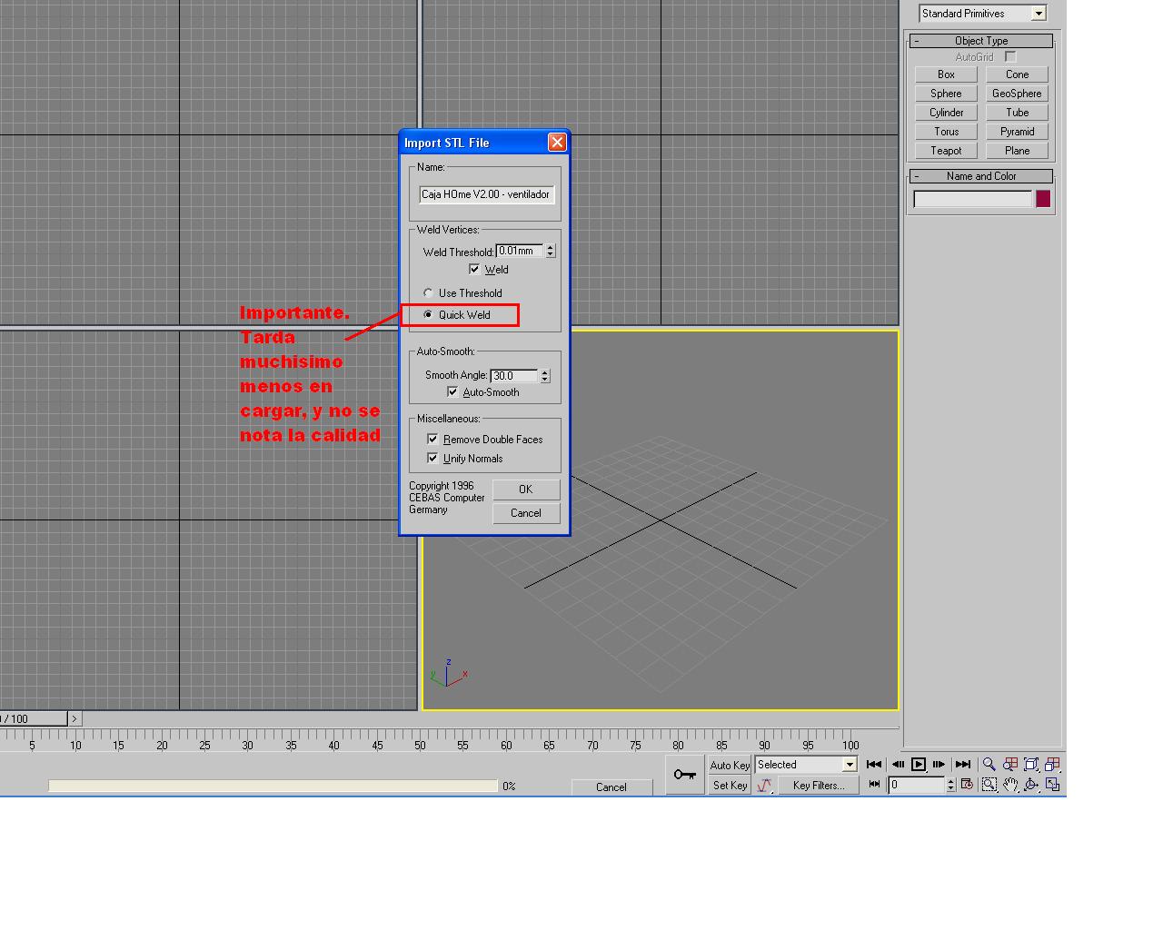 Eso sí, para que no te tarde en transformar, dentro de las opciones al importar a 3ds Max, está la posibilidad de elegir la opción de soldadura rápida (quick weld)
